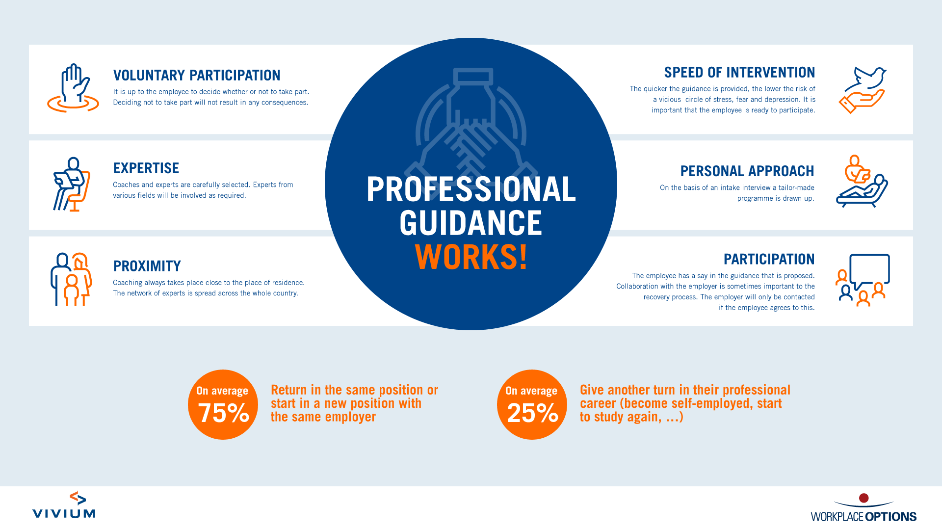 Vivium has partnered up with Pulso and Workplace Options, two independent employee well-being experts. Their specialised staff have a lot of experience in supporting employees. A personalised counselling programme is always their main focus. The track record of employee well-being solutions provider Workplace Options shows that their approach works.